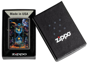 Die Bilder offenbaren eine leuchtende Sanduhr im Zentrum, umrahmt von einem kosmischen Hintergrund, in dem sich Erde, Mond und ferne Sterne abzeichnen. Dieses Feuerzeug ist mehr als ein Gebrauchsgegenstand – es ist ein Gesprächsstück, ein Symbol für Zeit, Ewigkeit und die unendliche Weite des Alls.