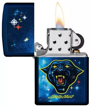 Au centre, une tête de panthère domine : noire, puissante, avec la gueule grande ouverte et les dents visibles. Le visage ne semble pas "gentil", mais déterminé et sauvage. Autour de la tête court un contour clair en jaune, qui détache le motif comme un emblème et le fait briller sur le champ d'étoiles bleues. Les yeux sont clairs, presque incandescents, et c'est précisément ce regard qui donne au motif son énergie : éveillé, prêt à attaquer, iconique. En dessous de la panthère, on peut voir l'inscription "SANTA CRUZ", comme une signature issue d'un contexte de skate ou de street art. Dans l'ensemble, le design rappelle les graphismes classiques des planches : fort, frappant, mais avec suffisamment de détails pour que l'on découvre toujours quelque chose de nouveau.