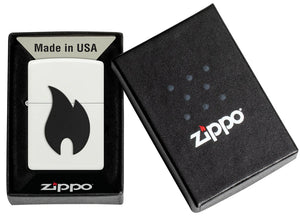 La troisième image présente l'emballage cadeau : le briquet repose dans un coffret noir avec un encart portant la mention « Fabriqué aux États-Unis », à côté du couvercle orné du logo. La présentation, classique et raffinée, met en valeur le contraste entre le blanc et le noir, donnant au produit l'allure d'un objet de collection. L'impression est immédiate : on le déballe, on le prend en main, on entend le clic caractéristique de l'ouverture, on découvre le mécanisme. Globalement, les images transmettent un message clair : un blanc mat et épuré, associé à l'emblématique flamme noire – moderne, contrasté, minimaliste et pourtant saisissant. Ce briquet séduira les personnes sensibles aux lignes nettes et aux objets discrets mais affirmés.