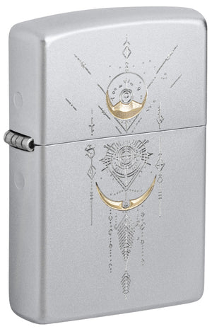 Sur les photos, vous découvrez un briquet qui mise sur la sobriété, la précision et le calme plutôt que sur des couleurs criardes. Sa surface arbore un aspect chromé satiné brossé, soyeux et lumineux : une finition métallique claire et froide qui diffuse délicatement la lumière, lui conférant une élégance rare. Au lieu d'un éclat miroir, on perçoit un toucher sobre, presque velouté, écrin parfait pour mettre en valeur ce qui rend ce modèle si particulier : une gravure géométrique délicate qui orne le couvercle et le corps, évoquant une interprétation moderne d'une méditation sur les formes. En son centre se trouve un élément rond, semblable à un mandala, composé de lignes fines, de points et d'une symétrie parfaite. En dessous, un motif vertical se déploie vers le bas, tel un ornement ou une amulette stylisée suspendue par des fils. Entre les lignes, de petits détails se dévoilent : losanges, traits, minuscules points, comme une poussière d'étoiles.