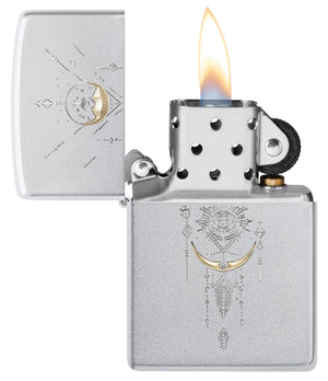 Ce qui frappe particulièrement, c'est l'effet bicolore de la gravure : certains éléments sont rehaussés d'une chaude teinte dorée, tandis que les autres restent en métal argenté. Cela crée une hiérarchie claire au sein du design, guidant le regard sans le surcharger. Les formes dorées en croissant attirent immédiatement l'attention, se détachant délicatement sur le fond froid. L'effet global n'est pas simplement décoratif, mais délibérément conçu : comme une pièce pensée pour exprimer l'équilibre, avec un point focal en haut et un second, plus grand, au centre du corps. Sur la deuxième image, montrant le briquet ouvert et allumé, on distingue l'insert classique avec pare-vent et la flamme stable. On comprend immédiatement : ce n'est pas seulement un bel objet, mais un outil fiable au quotidien. La troisième image souligne son aspect cadeau : le briquet repose dans son coffret, à côté du couvercle orné du logo. Il dégage ainsi une impression de grande qualité – idéal pour offrir ou se faire plaisir avec un objet durable. La garantie fonctionnelle à vie vient parachever cette impression : ce modèle est conçu pour une utilisation à long terme, et non pour des résultats rapides.