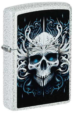 Auf den Bildern wirkt dieses Modell wie ein Kontrast aus Frost und Feuer: Das Gehäuse zeigt sich in einem hellen, gesprenkelten Finish, das an vereistes Metall, gefrorenen Stein oder fein verteilten Schnee erinnert. Diese kühle Optik rahmt ein tiefschwarzes Frontfeld ein, das wie eine Bühne für das eigentliche Motiv dient. In der Mitte thront ein Totenkopf, detailreich und stilisiert, aber nicht plump oder „Comic“ – eher wie ein kunstvolles Emblem. Die Augenhöhlen leuchten in einem intensiven Blau, fast wie kaltes Neonlicht. Genau dieses Blau zieht den Blick an, weil es nicht nur Farbe ist, sondern Stimmung: geheimnisvoll, wach, ein wenig düster – und gleichzeitig elegant.