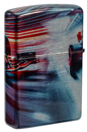 Auf den Bildern siehst Du ein Feuerzeug, das Geschwindigkeit nicht nur zeigt, sondern förmlich ausstrahlt. Das Motiv zieht sich als 540°-Design rund um das Gehäuse und wirkt wie eine eingefrorene Szene aus einem Nachtrennen: Ein Formel-1-Bolide schiesst durch die Kurve, die Bahnlichter werden zu farbigen Streifen, und die Perspektive ist so nah am Fahrzeug, dass man fast den Luftzug spürt. Auf der Front erkennst Du die aggressive Silhouette des Wagens mit breiten Reifen, tiefem Frontflügel und klaren Linien, die in Blau-, Rot- und Metallic-Tönen schimmern. Der Hintergrund ist keine ruhige Fläche, sondern ein Strudel aus Bewegung: Lichtspuren, Reflexe, Fahrbahnstruktur – alles deutet auf Tempo und Kontrolle hin.