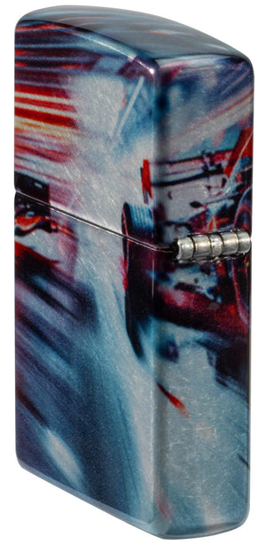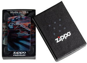 Die Oberfläche wirkt wie Tumbled Chrome: leicht unregelmässig, mit einer dezenten Struktur, die das Licht bricht und dem Druck Tiefe gibt. Die Farben wirken dabei nicht flach, sondern wie in Schichten – passend zur Bezeichnung Fusion. Auf einem Bild siehst Du das Modell geöffnet: Der klassische Einsatz aus Metall steht im Kontrast zur Rennästhetik, und die Flamme sitzt wie der letzte Funken über der Szene. Das Foto mit der Premium-Geschenkbox rundet das Ganze ab: “Made in USA” im Deckel, darunter die Premium-Präsentation, die dem sportlichen Charakter einen hochwertigen Rahmen gibt. Insgesamt wirkt dieses Modell wie ein Sammlerstück für Motorsport-Fans – und gleichzeitig wie ein Accessoire, das man gern im Alltag dabeihat, weil es jedes Mal kurz an die Faszination von Tempo erinnert.