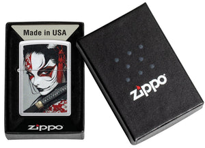 Ein Blick auf dieses Feuerzeug genügt, um seine ganze Intensität zu spüren: Die Samurai-Kriegerin blickt den Betrachter mit durchdringendem Blick an, ihr Gesicht kunstvoll mit roten und schwarzen Mustern verziert, die an traditionelle Kriegsbemalung erinnern. Der Kontrast zwischen der kühlen Satinoberfläche und der farbintensiven Illustration lässt dieses Stück wie ein kleines Kunstwerk wirken. Kraft, Eleganz und eine geheimnisvolle Aura verbinden sich hier zu einem Accessoire, das weit mehr ist als ein Gebrauchsgegenstand – es erzählt eine Geschichte von Stärke, Entschlossenheit und Individualität.