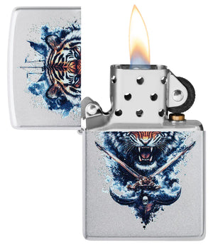 Was du auf den Bildern siehst, ist ein Feuerzeug, das sofort nach „Statement“ aussieht: ein kühles Satin-Chrome-Gehäuse mit weichem Schimmer, darauf ein hochdetailliertes Farbbild, das wie eine Szene aus einem Abenteuerroman wirkt. Im Zentrum steht der Tigerkopf – frontal, wach, kompromisslos. Die Augen sind scharf gezeichnet, das Maul ist geöffnet, die Zähne blitzen, als würde er gerade ein Warnsignal in die Luft werfen. Um das Gesicht herum wirken blaue Spritzer und Nebel wie aufgewühltes Wasser oder Tinte, die sich im Sturm verteilt. Das Motiv ist nicht einfach „aufgedruckt“, sondern so komponiert, dass es aus der Fläche hervorbricht: Die schwarzen Streifen, das warme Orange im Fell und die kühlen Blauwerte erzeugen Spannung und Tiefe.